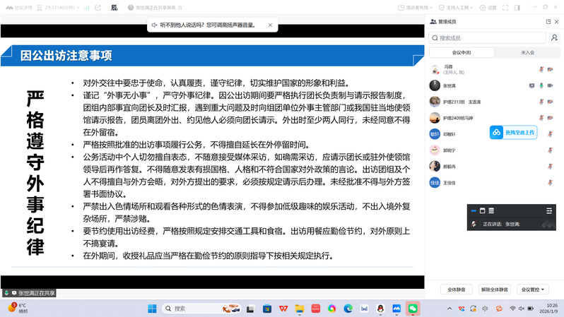 为进一步加强因公出国(境)人员管理,强化在外期间的纪律规矩与安全责任意识,保障学生假期出国(境)交流项目顺利开展,1月9日上午,国际合作交流处面向护理学院赴泰国师生团组开展出国(境)项目行前培训会。会议以线上线下结合形式召开,由国合处张世满老师主讲。护理学院院长王春桃出席培训会,团组负责人冯蓉及6名参团学生参加会议。会议由护理学院副院长郭玲玲主持。